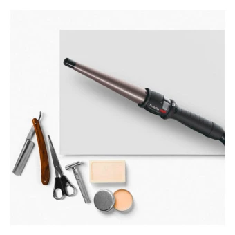 Konisch zulaufendes Frisiereisen mit Titanium-Tourmalintechnologie. Unterstützt den ionisierenden Effekt, bringt auf sanfte Art Locken und Wellen ins Haar und gibt geschmeidigen Glanz. Dieses Gerät ermöglicht Ihnen verschiedene Stylings, von kleinen Locken über leichte Wellen bis hin zu großzügigen Wellen.
