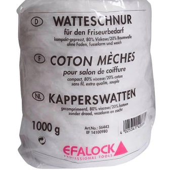 Watteschnur für den Friseurbedarf. Kompakt-gepresst, 80 % Viskose, 20 % Baumwolle, ohne Faden, fusselarm und weich. 1000 g pro Packung.
