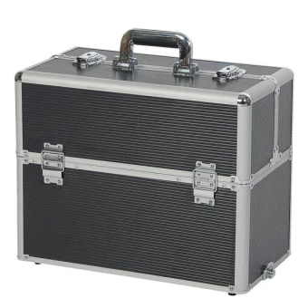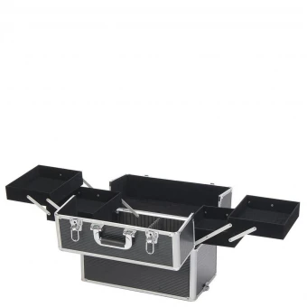 Das obere Koffer-Element öffnet sich mit einem zweigeteilten Deckel. Darunter finden Sie vier Fachelemente, die über Gelenke fächerförmig auseinander geschoben werden können. Viel Stauraum für kleinere Materialien finden Sie hier.