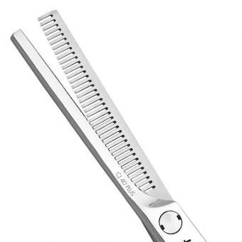 40 Effilierzähne mit feinster Prismenverzahnung für ein angenehm sanftes Gefühl und einen präzisen Schnitt. Mit ergonomisch abgewinkeltem Daumenauge und flacher Messingschraube.