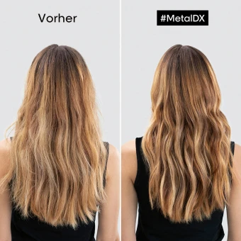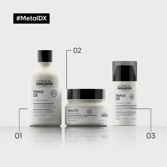 Anwendung: Trage die Serie Expert Metal DX High Protection Cream täglich auf das frottierte Haar auf. Abhängig von deiner Haarlänge reichen 1 bis 3 Pumpstöße aus, die in Längen und Spitzen verteilt werden. Kein ausspülen notwendig. Setze dann dein gewohntes Styling fort.