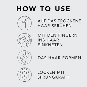 Anwendung: Auf das trockene Haar sprühen. Mit den Fingern in das Haar einkneten und Definition, Form sowie Sprungkraft der Locken wiederherstellen.