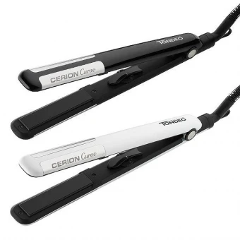 Profi Styler für perfekt geglättetes Haar oder lebendige Locken mit seidigem Glanz. Silberne, hochglänzende, abgerundete Curve-Einsätze an den Außenkanten formen lebendige Locken. Tiefschwarze, keramik-/turmalinbeschichtete Heizplatten für eine optimale Wärmeverteilung, schonende Formung und neuen Glanz.